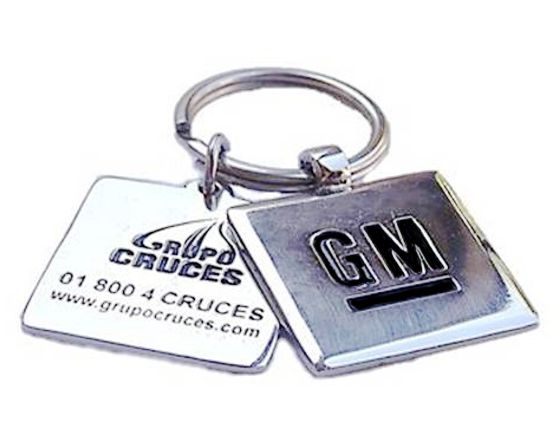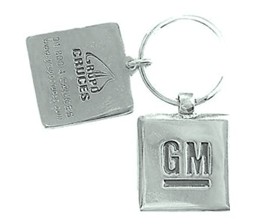 Llavero fundido logotipo GM acabado niquelado , publicidad fundida sobre placa anexa