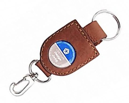Llavero fabricado en piel con bandola, publicidad en placa de estireno con resina.