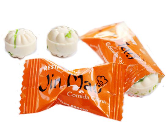 sobre con un dulce caramelo impreso 1 vista , sabores frambuesa con chile ,frutas y menta